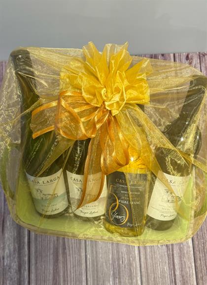 Celebrate in style with this elegant collection featuring Celebriamo Sparkling Wine, 50th Anniversary Barrel Fermented Vidal Blanc, Meritage, and our Dry Riesling, beautifully presented in a luxurious organza bag.