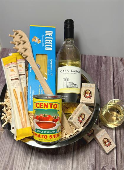 Savor a cozy pasta night for two with this carefully curated gift. Featuring Casa Larga’s Pallido Estate White Wine and all the essentials for a delicious Italian-inspired dinner, elegantly presented in a 5-quart stainless-steel colander.