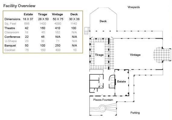 Each space offers its own unique character and amenities. Click to explore the features of our Estate Room, Tirage Room, The Deck, Front Patio, Vineyard Band Stand, Bridal Suite, Cafe, and Mezzanine Lounge.